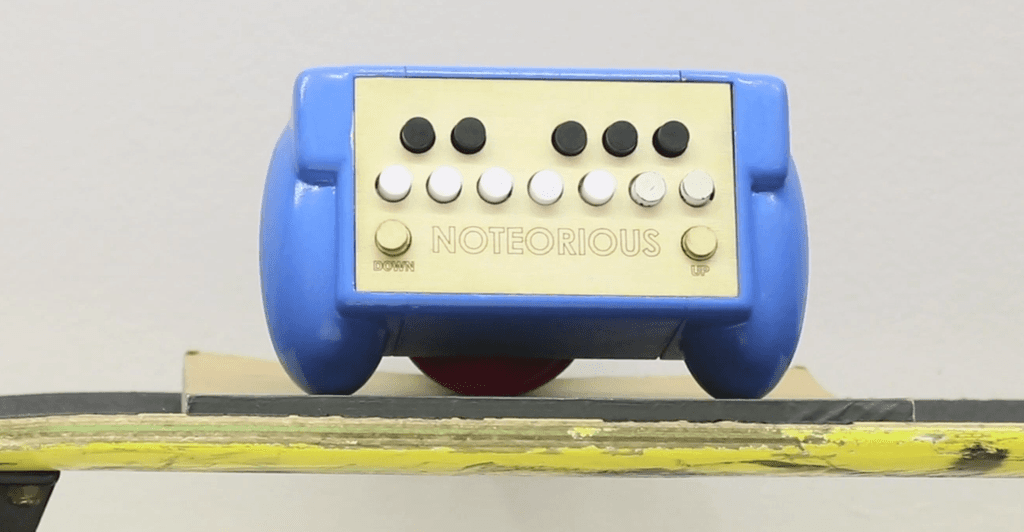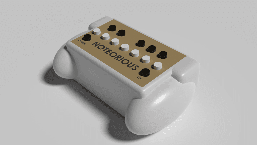 "Noteorious" is an augmented MIDI controller concept that offers a different type of interaction for music production through NIME (New Interfaces for musical expression). The product provides a gamified entry point for newcomers to the music production industry, lessening the learning curve of production software such as Ableton and how to create expressive music. Taking elements from preconceived affordances from gaming controllers and piano layouts, Notorious limits the cognitive load bestowed upon users whilst providing an engaging user experience through gamification.