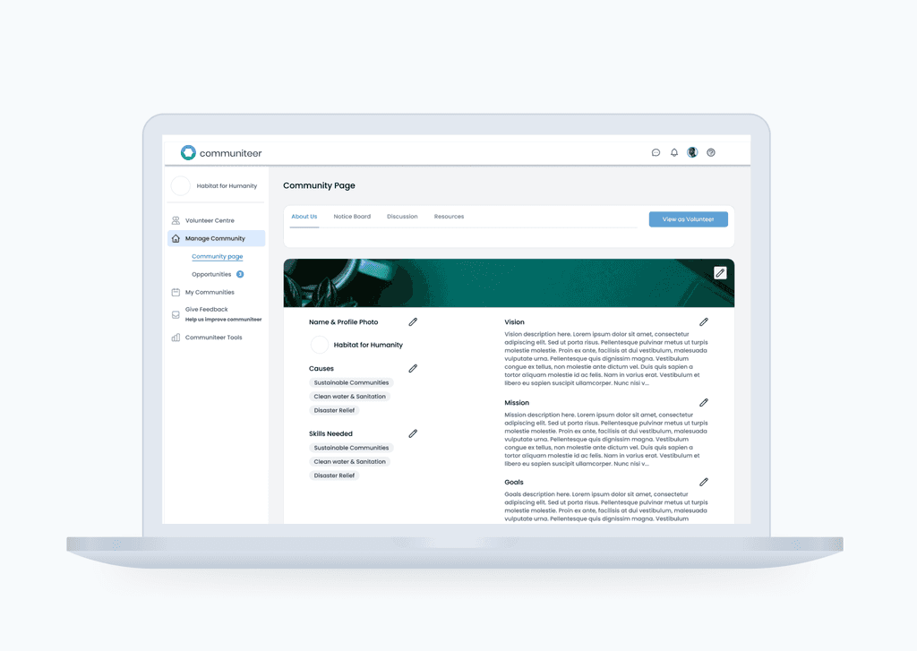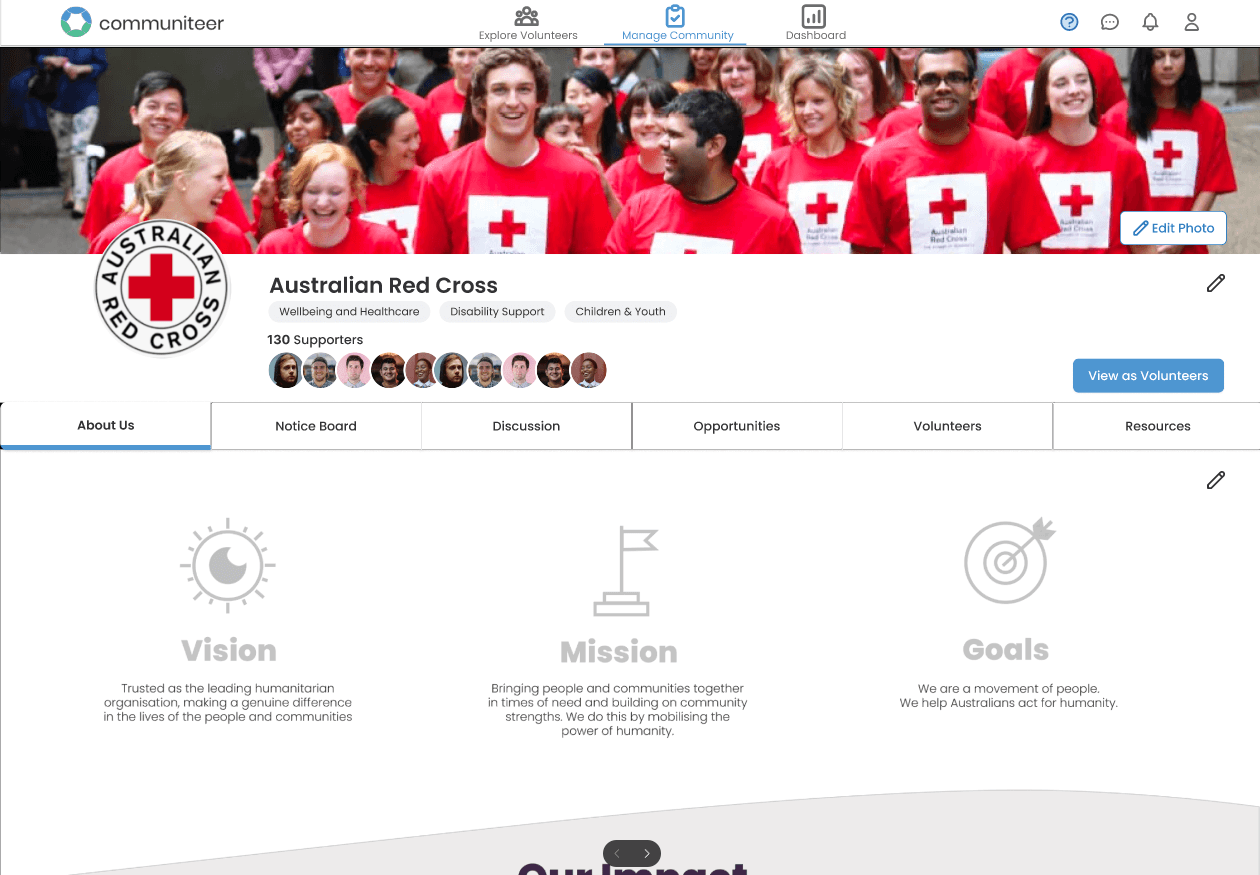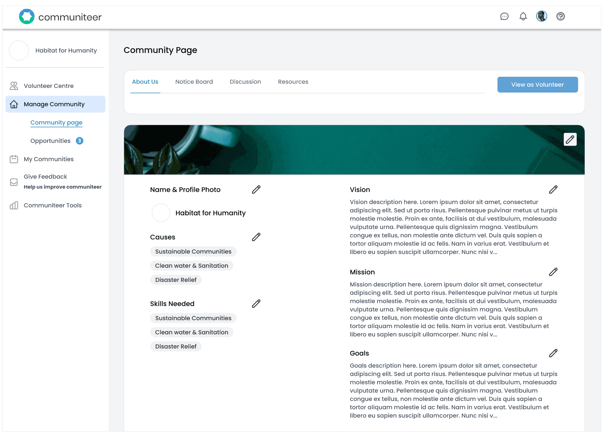 Showcasing a not for profit or social enterprise comes with being able to communicate effectively what the organisation's vision, mission, goals, and the skillsets they currently require to further their impact within their own domains. We prioritised overarching engagement and interaction with their own volunteers with a simplified method to edit the about us, add comments to the notice board, engage with volunteers in discussion, and upload resources.