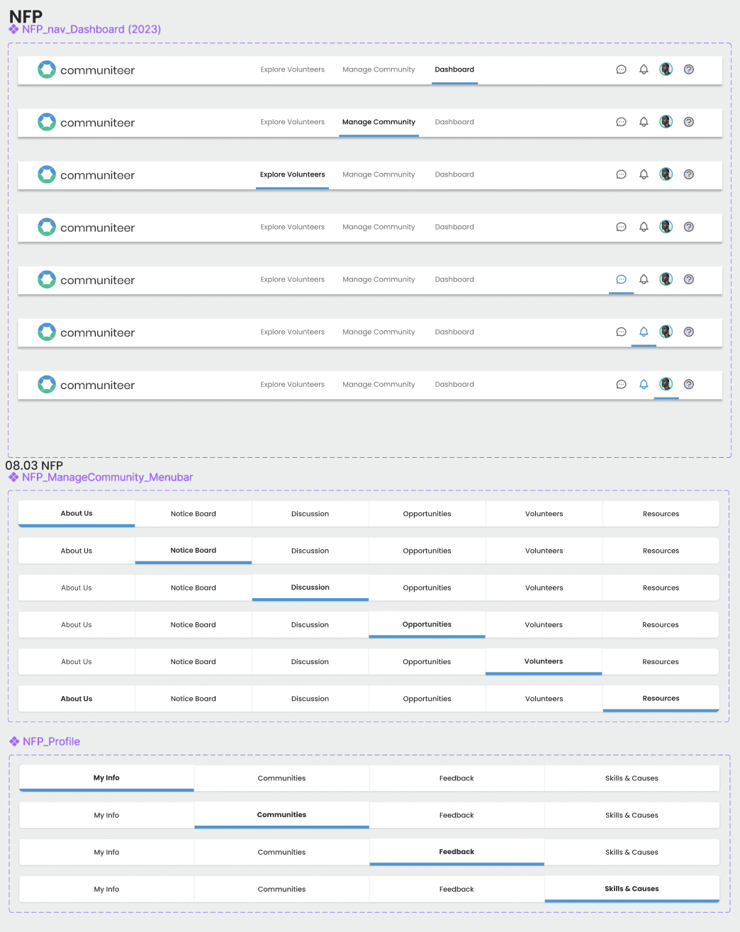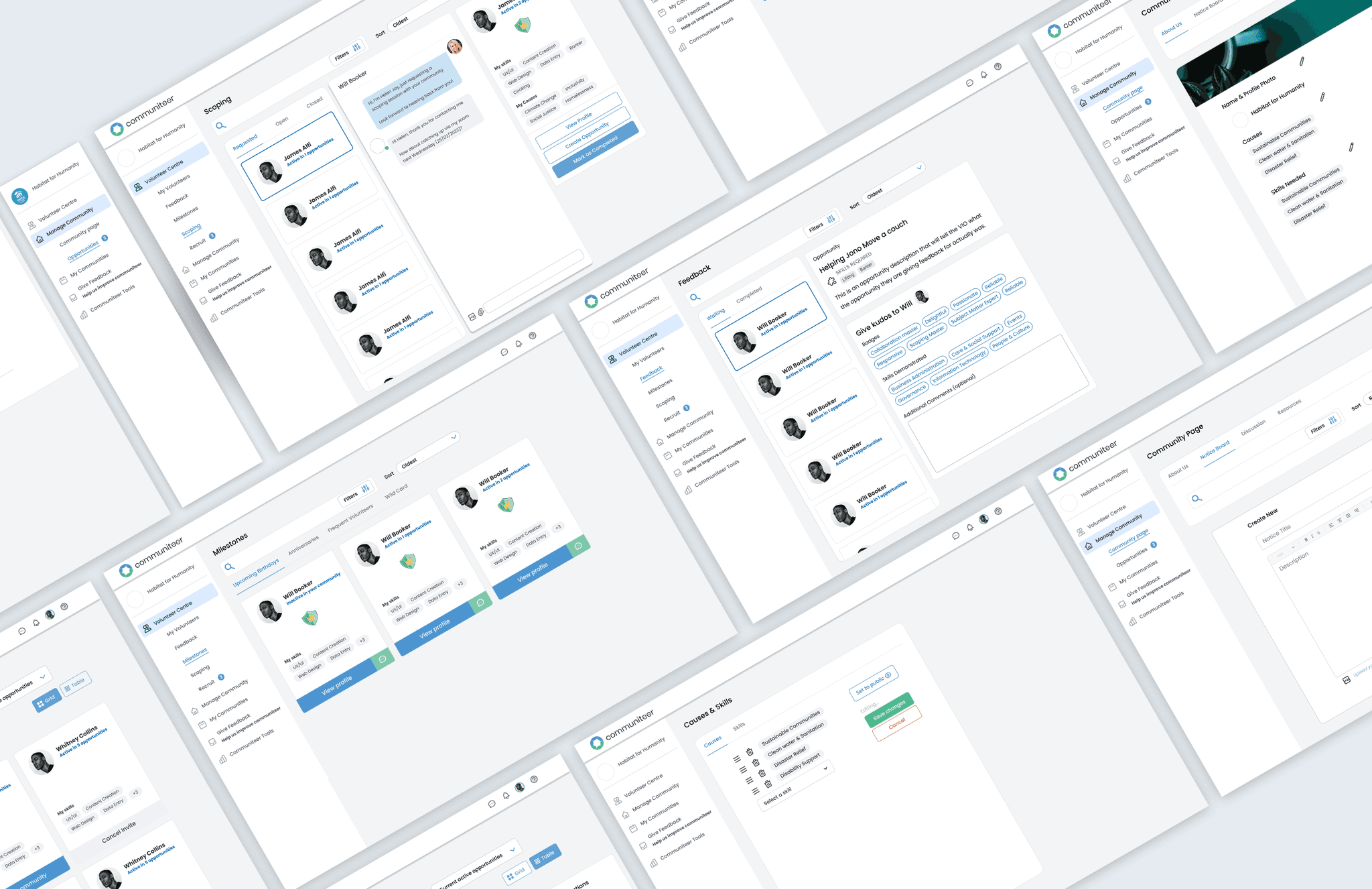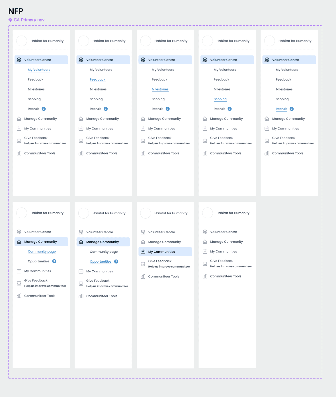 Building on top of Communiteer's existing UI component library, we were able to quickly adapt and generate new components in order to match brand guidelines as well as what was needed for building out the volunteer management dashboard to ensure consistency throughout the web application. The updated navigation would in turn reduce the interaction cost of getting to a given action as well as provide visibility to what community (not for profit) the volunteer manager is currently managing; being an edge case for VM's who manage more than one community.