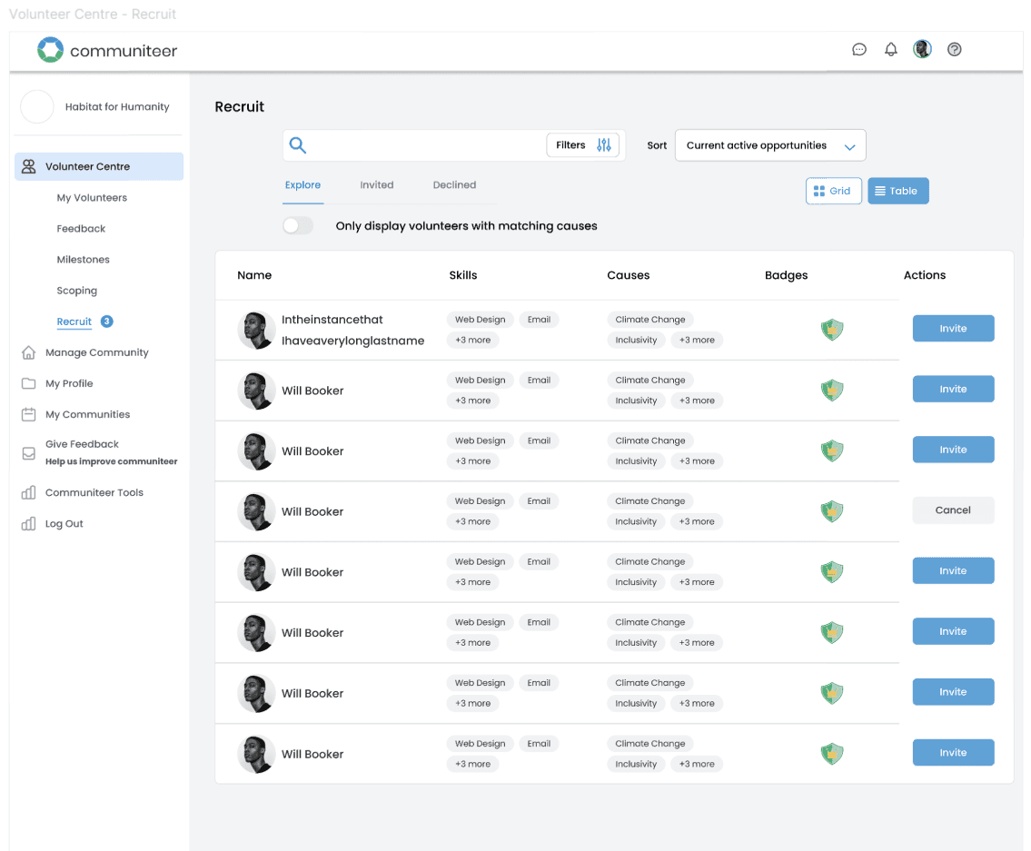Thanks to previously received feedback as well as usability testing, it was determined that volunteer managers would more often than not search for their own volunteers in the "explore" section of the web app. Using the correct terminology around exploring and recruiting volunteers was essential in the volunteer centre workspace for the volunteer management view.
