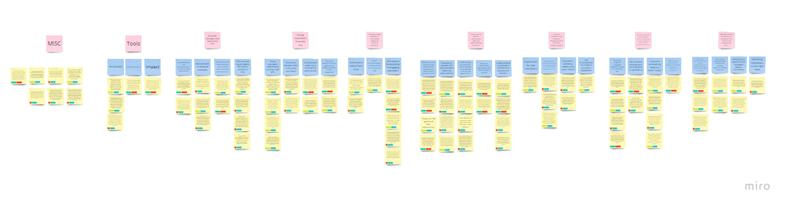 Understanding user needs is key to building a great product. Based off of both Communiteer's existing knowledge, supplemented with user interviews, the pain-points that inhibited young adults as well as what they valued when volunteering became evident. This was then sorted through affinity diagramming to determine core user needs.